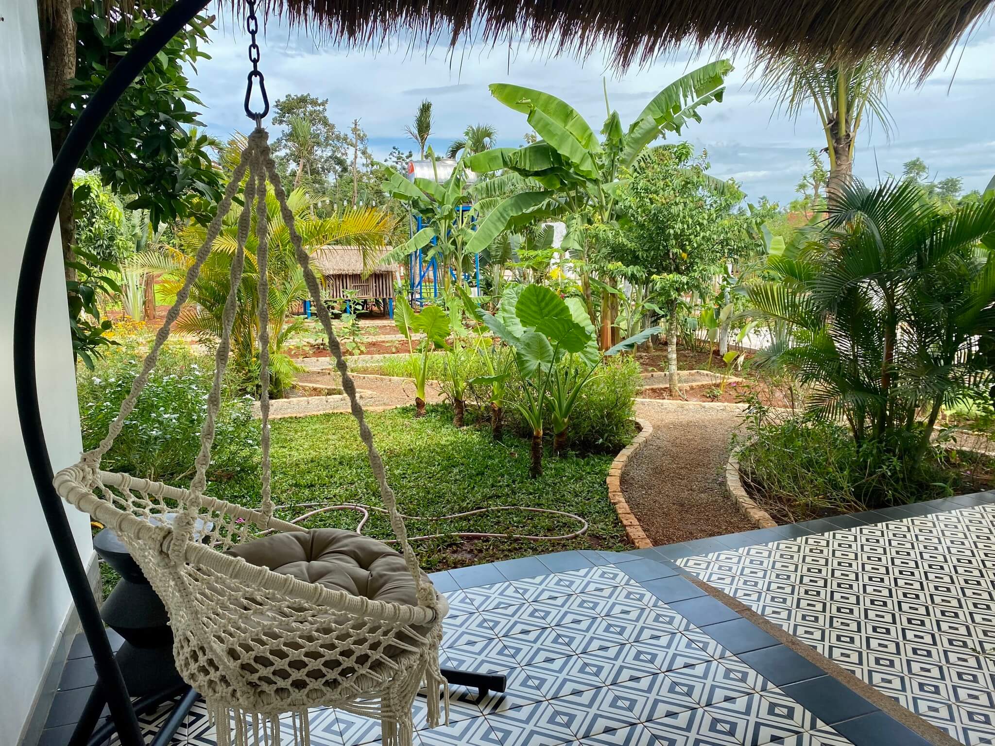 Lều Glamping Couple được bao quanh bởi những khóm trúc xanh mát, mang lại cảm giác trong lành, thư thái mỗi khi thức dậy. Và lều camping có view nhìn ra vườn cau cùng bãi cỏ xanh mượt, để bạn được hòa mình vào thiên nhiên.
